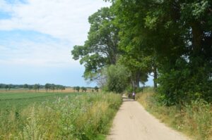 Droga szutrowa między Krzyżanami i Koczarkami miejscami jest pagórkowata, jednak odcinek nie jest długi, a pejzaże łagodzą trudy pedałowania. Jedziemy między rozłożonymi na wzgórzach polami i niewielkimi odcinkami lasu. W Koczarkach wjeżdżamy na drogę asfaltową.